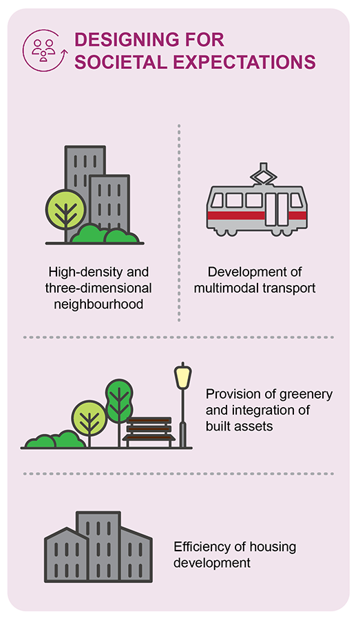 1. Designing for societal expectations: Building resilient communities and transportation networks amidst rapid urbanisation by improving building design, using the latest technologies and the promotion of people-oriented streetscapes within the built environment.